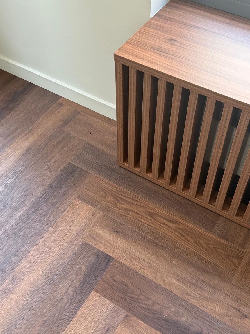 В реализации объекта использовано КОМПОЗИТНОЕ ПОКРЫТИЕ SPC KARELIA SEA HERRINGBONE (АНГЛИЙСКАЯ ЕЛКА) ROMANCE LINCOR HB